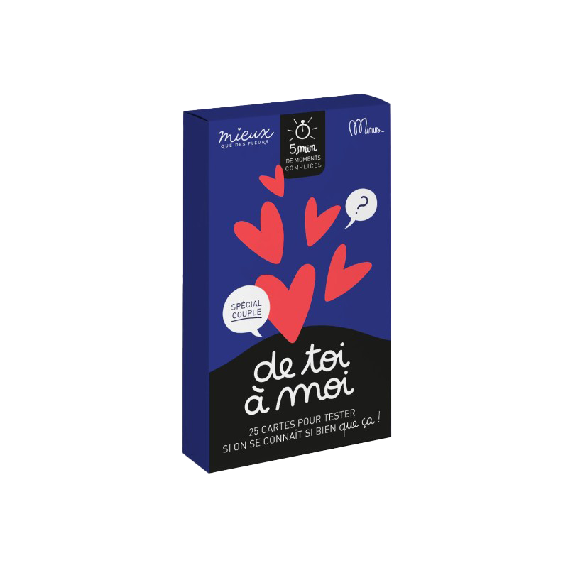 DE TOI À MOI est un jeu de cartes imaginé pour les duos : en couple, en date, ou simplement à deux pour se (re)découvrir. Né d’une collaboration avec Mieux que des fleurs, il vous propose de vous glisser dans la peau de l’autre à travers 50 questions aussi drôles que révélatrices : qui prend vraiment les décisions ? qu’est-ce qui vous a fait craquer ? Résultat : des débats sans fin, des fous rires… et surtout un vrai moment de complicité, rien qu’à deux.